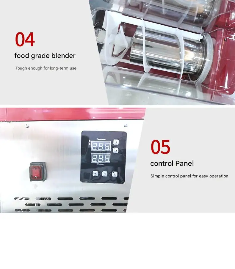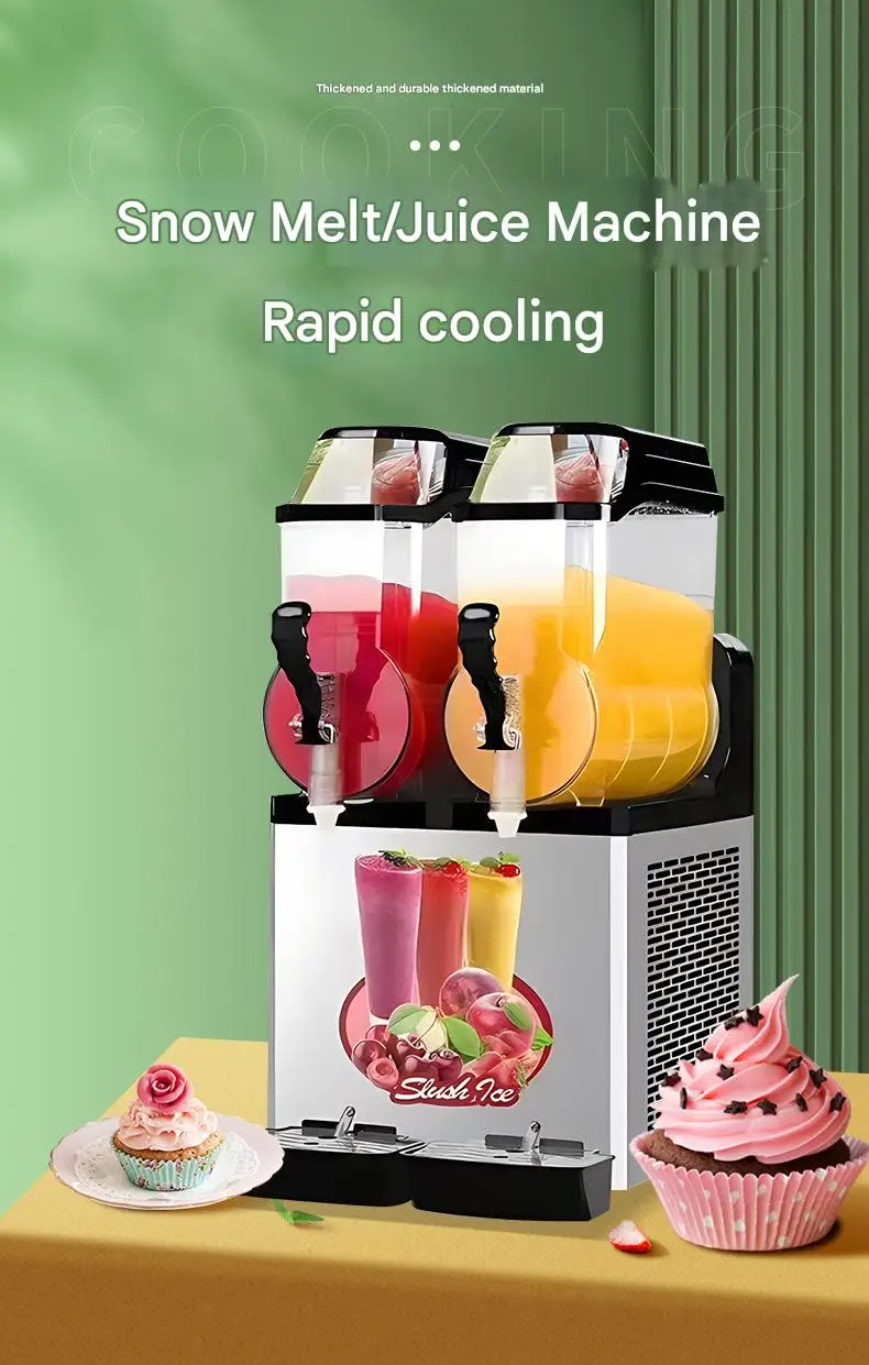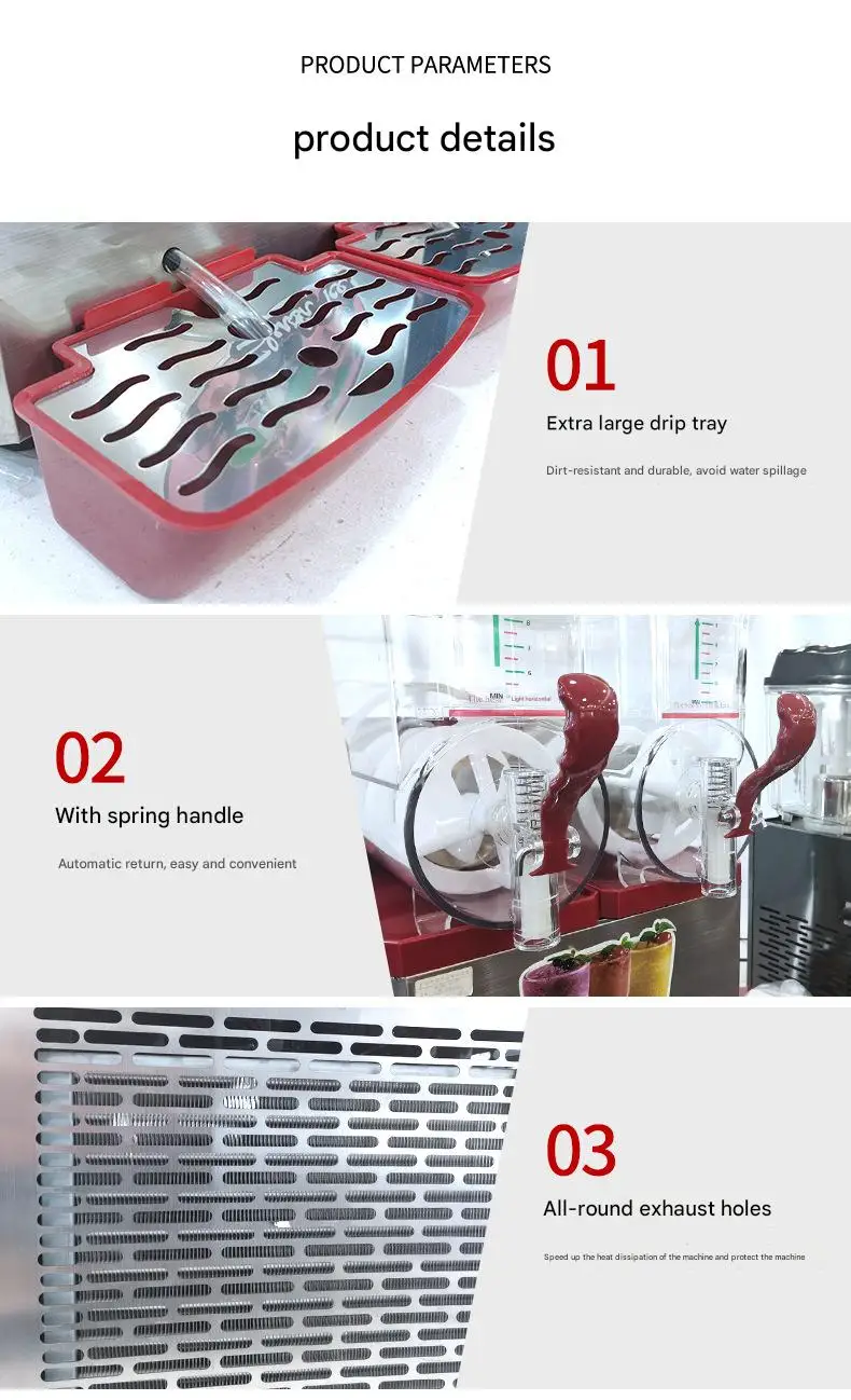 This commercial slush machine features a compact and luxurious design, made of durable ABS panels and food-grade polycarbonate tanks. It ensures easy operation, low noise, air cooling, and energy-saving performance. Equipped with advanced electronic temperature control, an automatic mixer, and LED illumination, it delivers functionality and hygiene for versatile use as a cold drink or fruit juice dispenser.